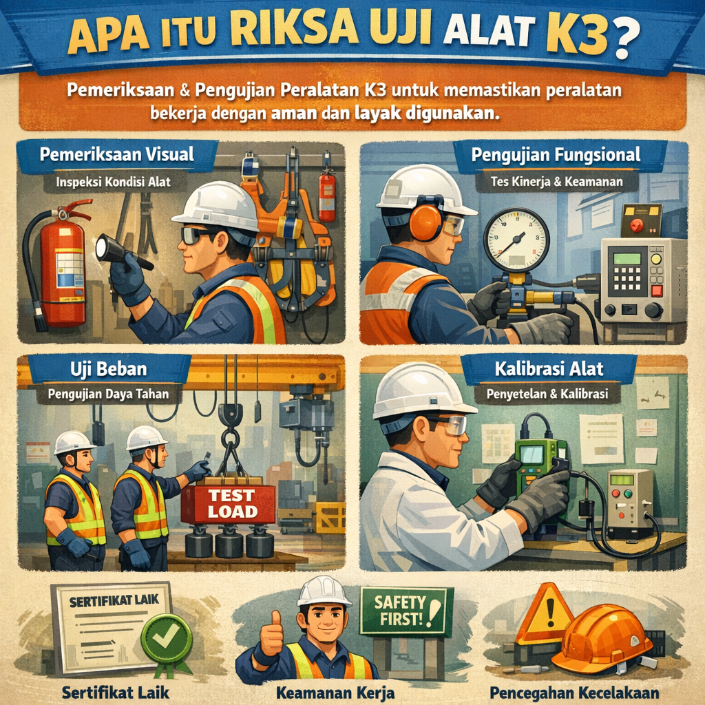 Riksa Uji K3 adalah kegiatan pemeriksaan dan pengujian teknis terhadap peralatan, instalasi, dan sistem kerja untuk memastikan bahwa seluruh objek K3 aman digunakan, laik operasi, dan memenuhi standar keselamatan serta peraturan perundang-undangan yang berlaku.
